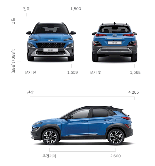 2022 코나 제원은 전장 4,205mm / 4,215mm (N Line), 전폭 1,800mm, 전고 1,550mm / 1,560 (N Line), 축거 2,600mm입니다.