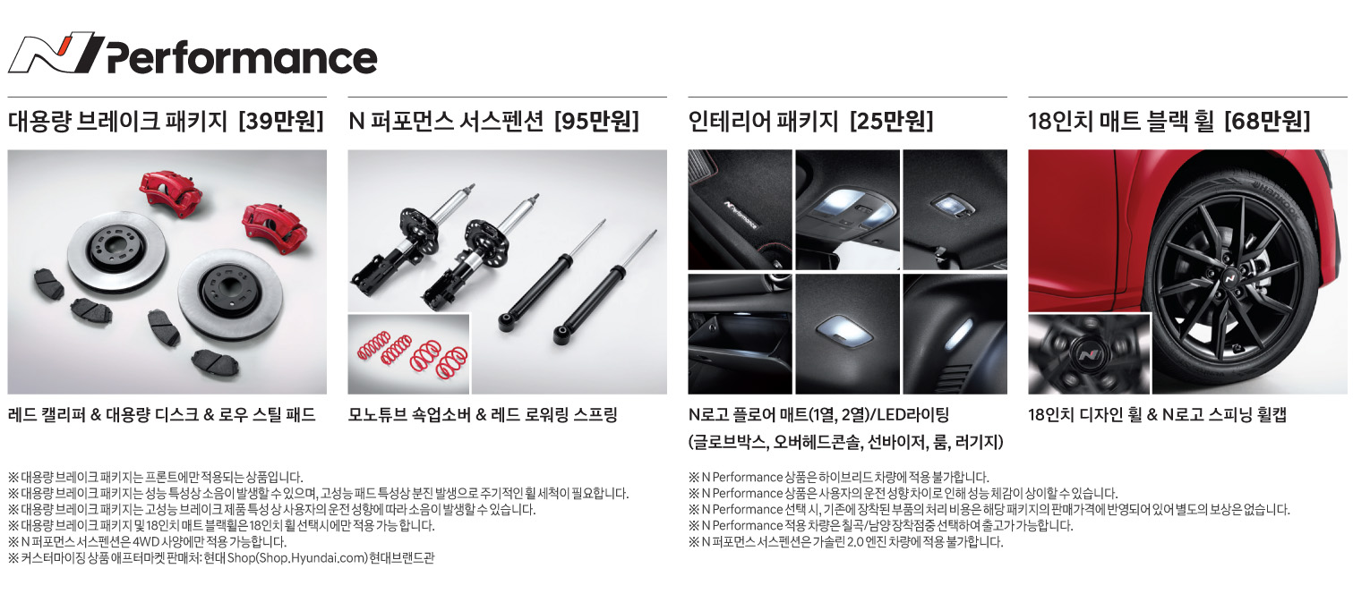 코나 n퍼포먼스 가격은 대용량 브레이크 패키지가 39만원, N 퍼포먼스 서스펜션이 95만원, 인테리어 패키지가 25만원, 18인치 매트 블랙 휠이 68만원입니다.