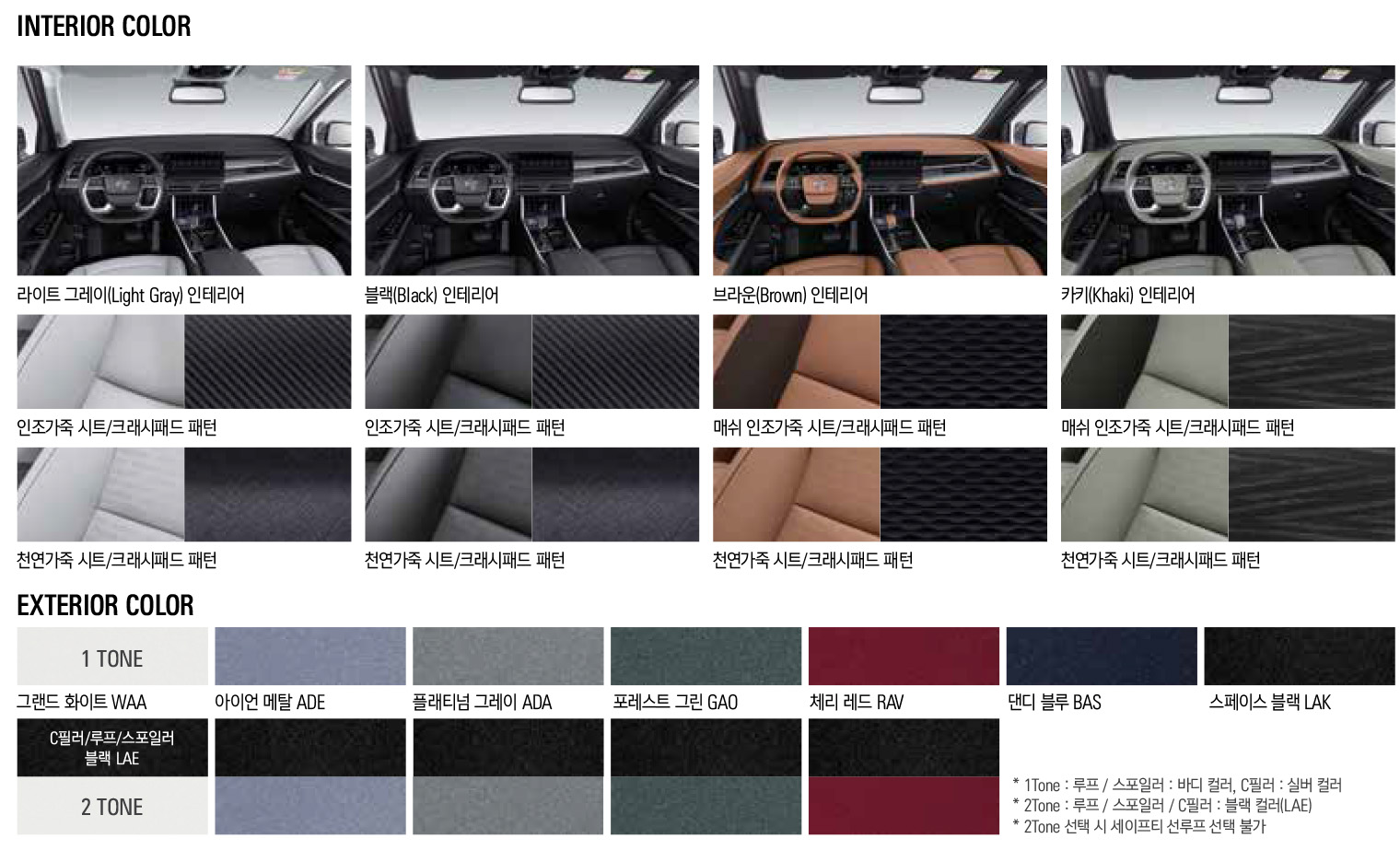 토레스 실내 색상은 블랙 인테리어, 라이트 그레이 인테리어, 브라운 인테리어, 카키 인테리어 등 4가지 인테리어 컬러를 운영합니다.