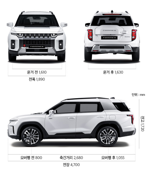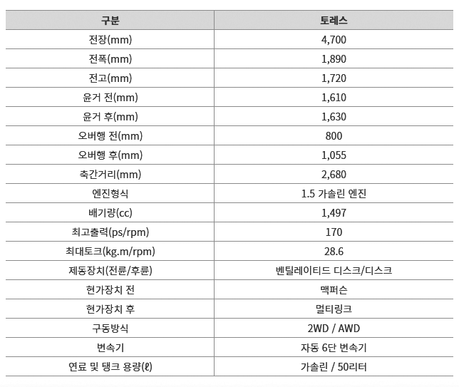 쌍용 토레스 제원은 전장 4700mm, 전폭 1890mm, 전고 1720mm, 축거(휠베이스) 2680mm이며, 코란도에 적용한 1.5ℓ 가솔린 터보 엔진과 아이신 6단 자동변속기와의 조합을 통해 최고출력 170마력, 최대토크 28.6kg.m의 성능을 발휘합니다.