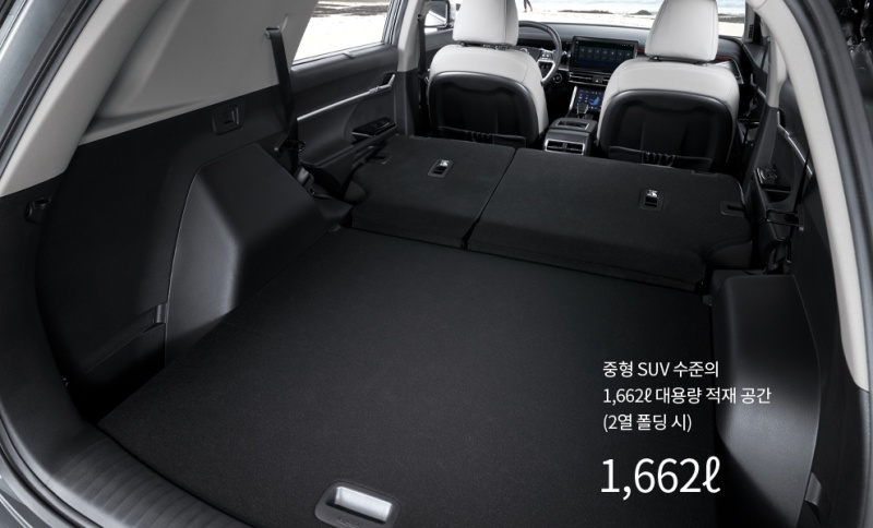 토레스 트렁크 공간은 골프백 4개와 보스턴백 4개에다 여행용 캐리어도 추가로 실을 수 있는 703ℓ(VDA213 기준 / T5트림 839ℓ)의 공간을 확보했습니다. 게다가 2열을 폴딩 하면 1,662ℓ 대용량 적재도 가능해 캠핑과 차박 등 레저활동에도 높은 활용성을 제공합니다.