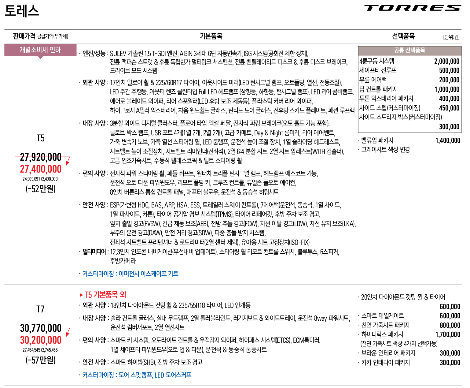토레스 가격은 개별소비세 인하 기준 T5 모델이 27,400,000원, T7 모델이 30,200,000원입니다.