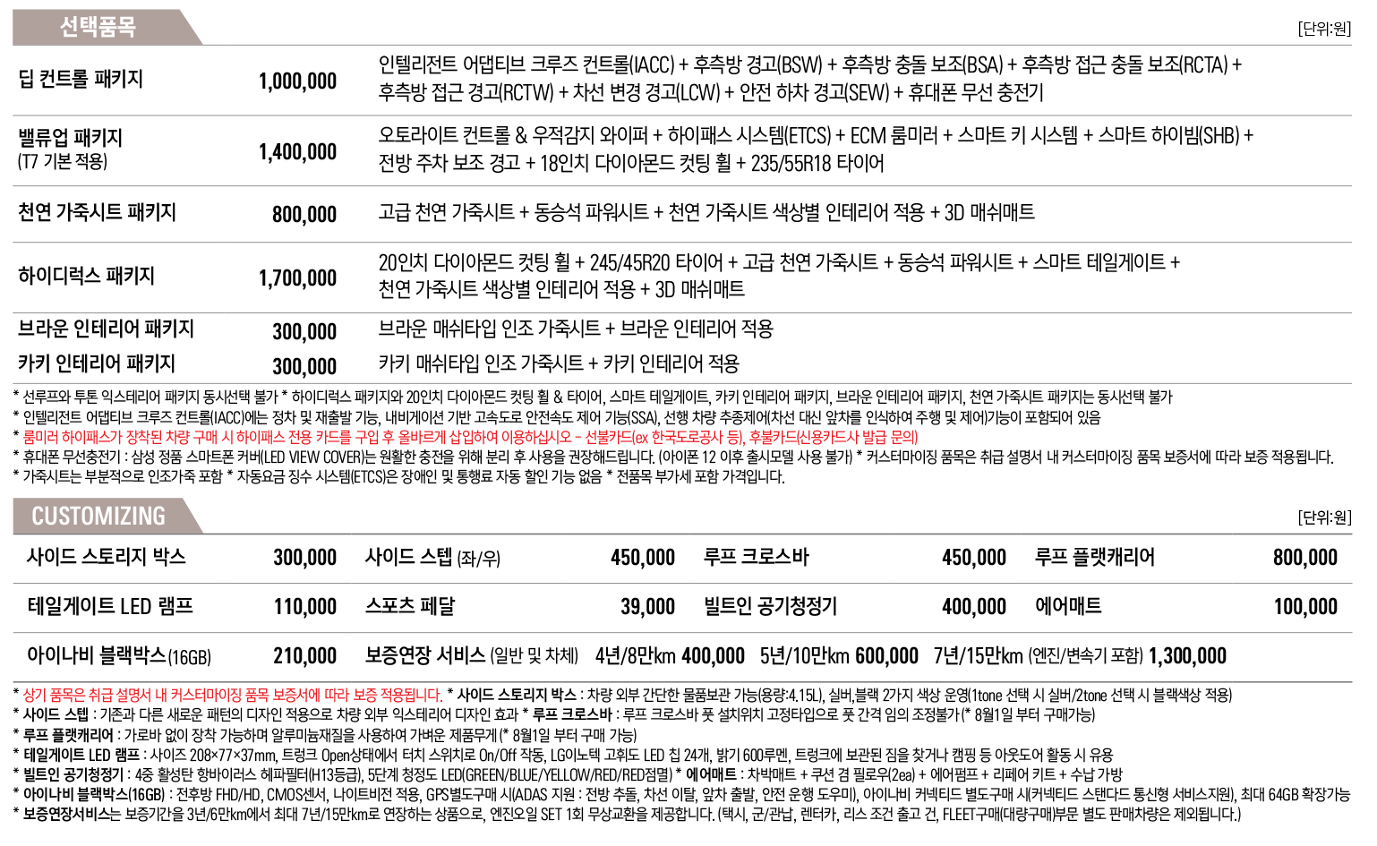 인텔리전트 어댑티브 크루즈 컨트롤(IACC)+후측방 경고(BSW)+후측방 충돌 보조(BSA)+후측방 접근 충돌 보조(RCTA) +후측방 접근 경고(RCTW)+차선 변경 경고(LCW)+안전 하차 경고(SEW)+휴대폰 무선 충전기 등이 포함된 딥 컨트롤 패키지는 100만 원이 추가됩니다.